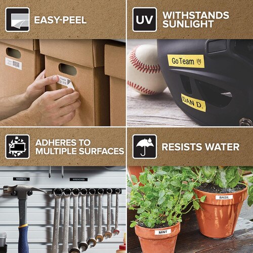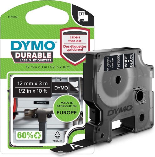 Tackle challenging labeling tasks and surfaces with labels that last longer than standard labels: DYMO D1 Durable Labels. Featuring professional-grade adhesive, this heavy-duty labeling tape resists fading, peeling and decay from moisture, high heat, freezing temperatures and household cleaners. Sticking strongly to a wide range of surfaces, these adhesive labels are perfect for garages, workshops, utility closets, kitchens and other spots that demand durability. What’s more, these indoor/outdoor labels are built with tear-resistant material and use thermal-transfer printing technology that prints labels with text that won’t smear. For labels that last, try DYMO D1 Durable adhesive labels.
